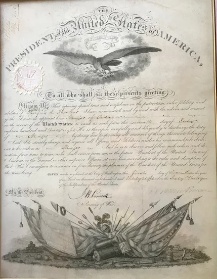 A one page document signed by Van Buren as President, appointing Rufus Baker to the rank of Major of Ordinance of the United States Army, December 1st, 1838. Also signed by J. R. Poinsett as Secretary of War. This handsome document has an engraved eagle vignette at the top and a military hardware scene of flags and cannons at the bottom. $1,895
