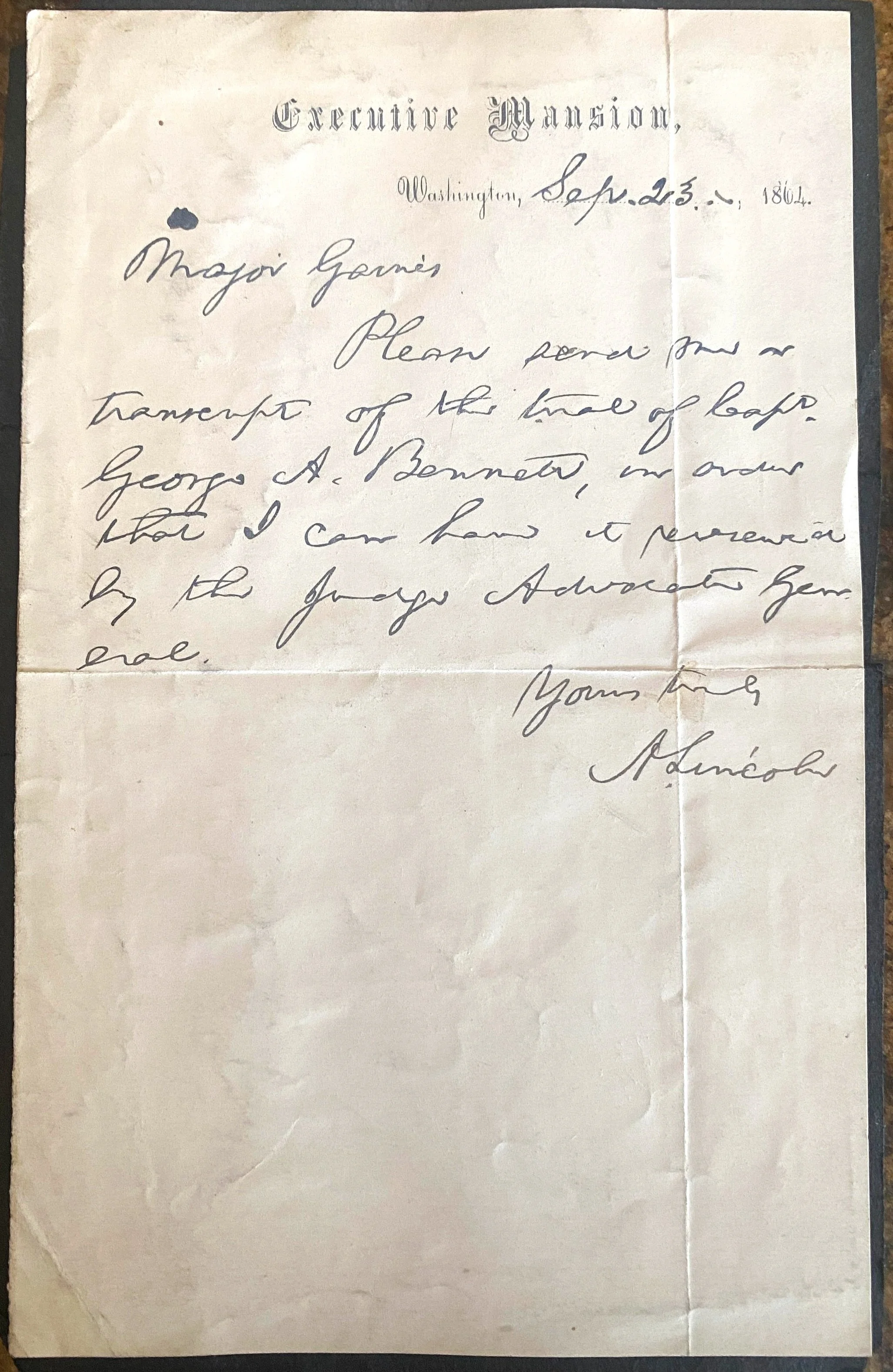 A one page, autograph letter signed as President on Executive Mansion letterhead from Washington, September 23rd, 1864, to Major Gaines. “…Please send me the transcript of the trial of Cap’t George A. Bennett, in order that I can have it reviewed by the Judge Advocate General. Yours truly, A. Lincoln.” George A. Bennett was the commanding officer of the Union Light Guard of Ohio, the group of specialized soldiers serving as the bodyguard to President Lincoln in and around Washington. Also known as the Seventh Independent Company [Squadron] of Ohio Volunteer Cavalry, the Union Light Guard was organized in late 1863 by Governor David Tod of Ohio, after growing sentiment that the President’s security was inadequate. Previously, the members of infantry stationed at the White House were quite limited in the scope of actions they were permitted to take, and had only been enlisted at the urging of Secretary of War, Edwin Stanton. Though Confederate sympathizers were plentiful in D.C. at the time and at least one potential plan to abduct President Lincoln had been discovered, Lincoln often made unaccompanied trips around Washington. Most mornings and evenings during the war, he would venture alone on foot to the War Department to receive the latest news from the battlefield. On many occasions, he would visit the wounded at the Soldier’s home near Washington and often spend the night there. After the formation of the Guard, they traveled there with him to ensure his protection. According to Robert W. McBride, member of the Guard and author of “Lincoln’s Bodyguard,” Lincoln’s “faith in his countrymen was such that… He could not believe that they would ever resort to political murder. He especially resented any suggestion that there was any such danger while he was mingling with the people on social occasions, or while he was visiting the theaters… Mrs. Lincoln did not share in this feeling. Her anxiety was such that… she privately requested that a detail from the Union Light Guard should… without Mr. Lincoln’s knowledge, be stationed in[side] the White House… until her fears were allayed…” Ironically, on the morning of his assassination, Lincoln had signed legislation which created the U.S. Secret Service, though it was then part of the Treasury Department and had been commissioned to curtail the counterfeiting of U.S. currency. The Secret Service wouldn't assume Presidential protection duties until the early 20th century. On the night of Lincoln’s assassination, the Union Light Guard was not on duty, as per the President’s wishes. Lincoln’s close friend and unofficial bodyguard, Ward Hill Lamon, was also not present. Four Metropolitan Police Officers were charged with the President’s protection that evening, with Officer John Frederick Parker assigned to the Presidential Box. At intermission, Parker went with Lincoln’s valet and coachman to a local tavern, where John Wilkes Booth also happened to be drinking. Parker was not at his post when Booth later entered the box, unimpeded.